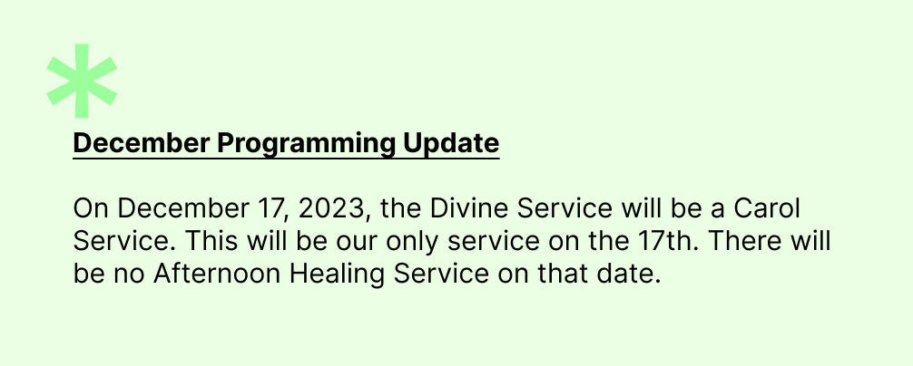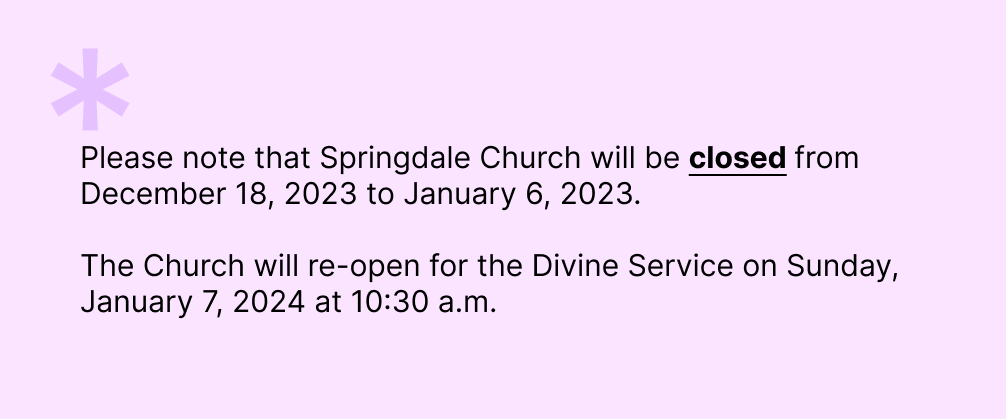 Springdale Divine Service, Sundays – 10:30 a.m. to 12 noon.